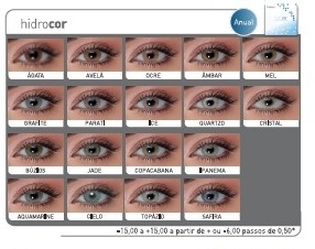 HIDROCOR - COLORIDAS ESFÉRICAS 1 Lentes de contato gelatinosa colorida. Descarte anual. Várias cores. Visão simples. Correção da miopia ou hipermetropia. A lente pode se com grau ou sem grau, plana. Geralmente usada para momentos em evento artístico.